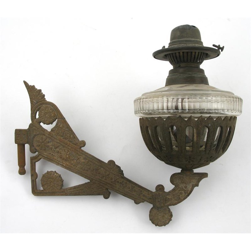 A set of three Gothic Revival cast iron wall lights, with hinged wall brackets, cast in low relief with stylised foliage, with glass oil reservoirs, and another similar stamped Rd mark 33.5 cm. wide