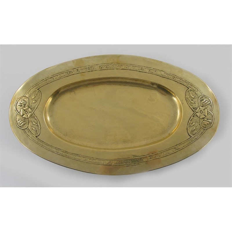 A Glasgow School hammered brass tray elliptical form, hammered in relief with a flower design forming a stylised butterfly, on four ball feet unsigned 52cm. wide