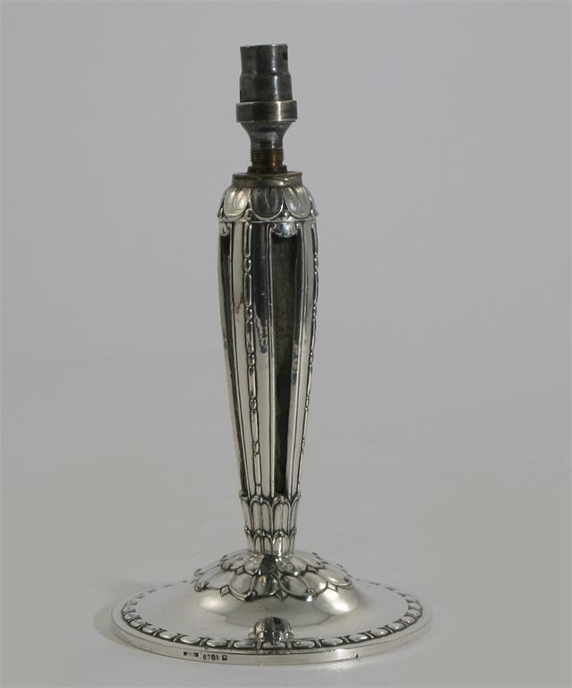 A Gallia, Christofle silvered metal lampbase, model no.5788, cast in low relief with foliate panels stamped marks to foot rim, 22cm. high