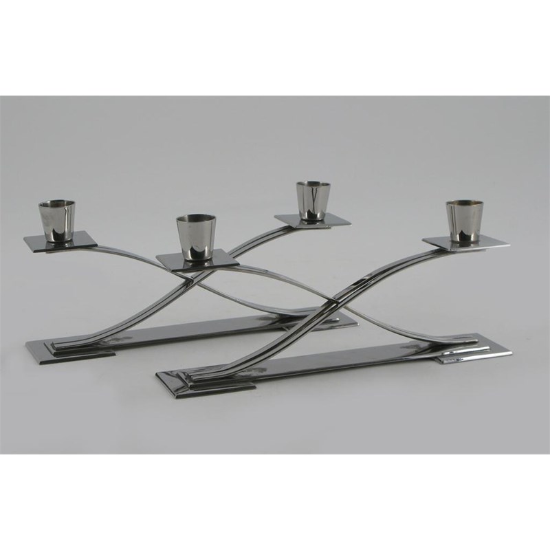 A pair of Art Deco chromed metal candlesticks, low, twin-branch form unmarked 25cm. wide