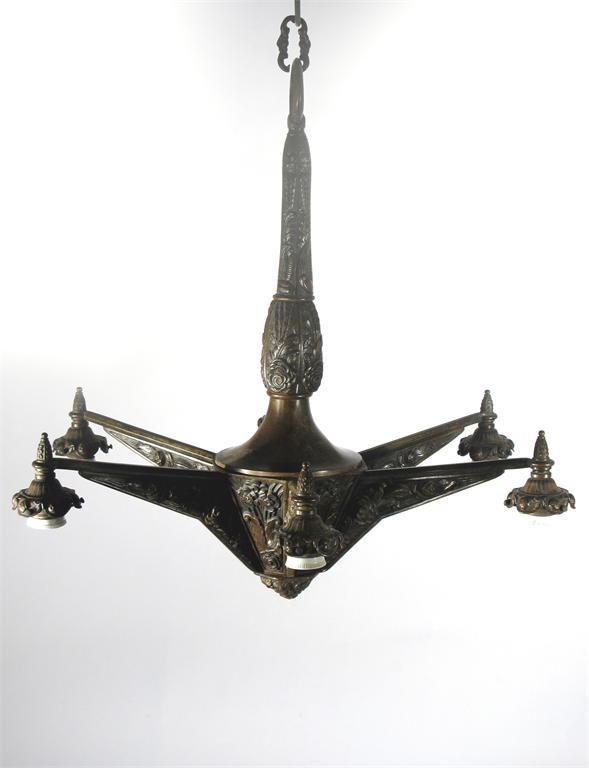 An Art Deco bronze ceiling light in the manner of Edgar Brandt,  six branches all cast in low relief with stylised flower panels, unmarked 64 cm. high