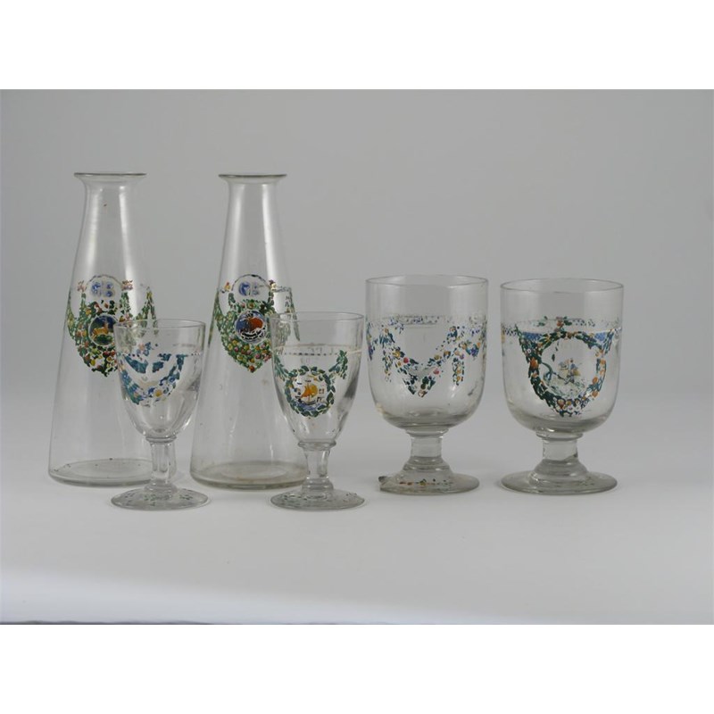 A part set of enamelled wine glasses possibly decorated by Gertrude Bayes, comprising two decanters, two wine goblets and two water goblets, each enamelled with floral swags and animals the glasses dedicated Gertrude and Gilbert Bayes, the decanters with GB roundels losses to enamels, chips to foot rim of one wine and one water goblet decanters 22cm. high