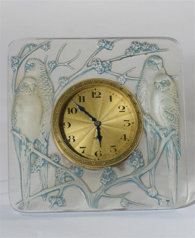 'Inseparables' No.765, a Lalique blue stained opalescent glass clock designed by Rene Lalique intaglio marked R Lalique 11cm. high