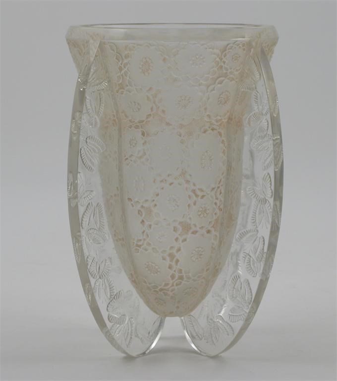 'Papillons' No.10-899 a Lalique clear and frosted glass vase with sepia staining to body, designed by Rene Lalique acid etched R Lalique France to foot, small chip to one foot 22.5 cm. high