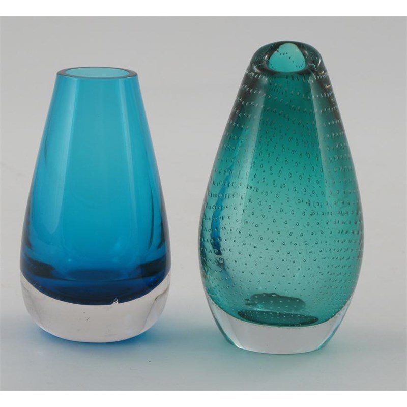 A Nuutajarvi glass vase by Gunnel Nyman blue glass cased in clear with air bubble inclusions, and another glass vase unmarked 13.5 cm. high