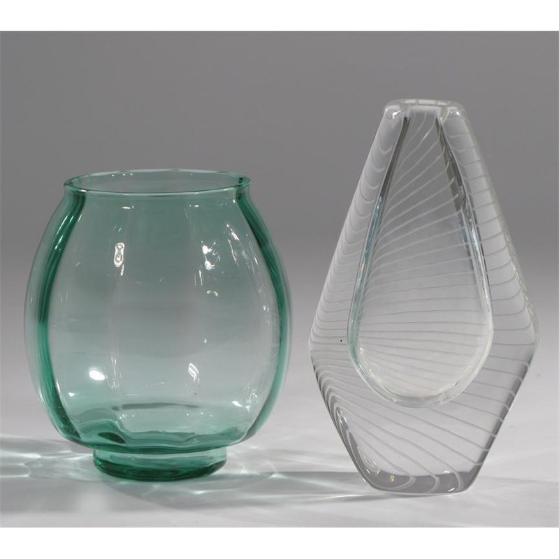 A Leerdam Unica glass vase faceted bottle green glass, and an Orrefors glass vase etched with diagonal lines attributed to Nils Landberg, acid etched Leerdam mark 13 cm. high