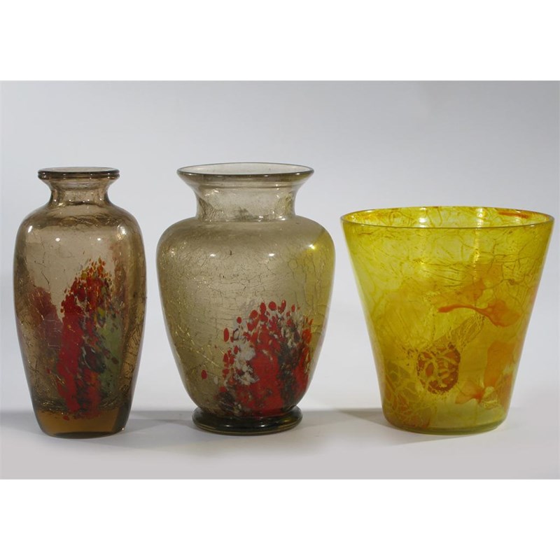 A WMF glass vase, mottled red and white, cased in clear with internal crackle effect, another similar and a vase attributed to Monart, unsigned 25.5cm.