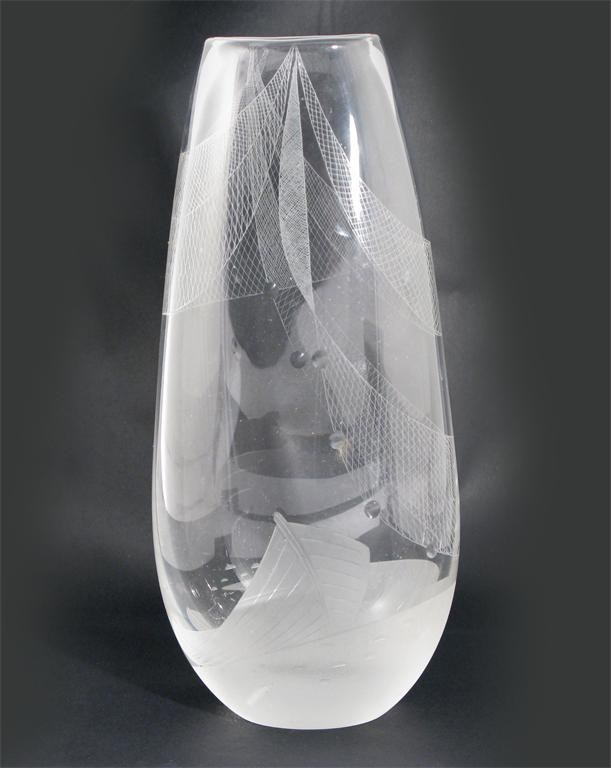 A Kosta engraved glass vase designed by Vicke Lindstrand, etched and engraved with a rowing boat on dry land, below swags of fishing net, etched Kosta LG 66, 33cm. high