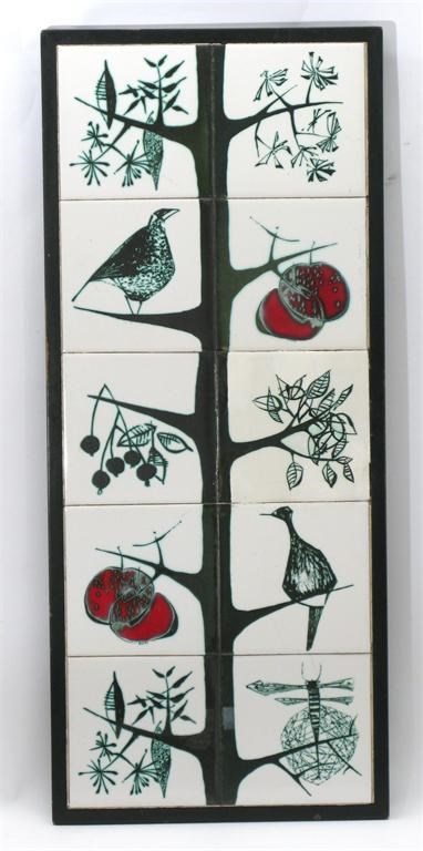 A Kenneth Clark Pottery tile top table by Ann Wynn Reeves, ten tiles, painted with birds, fruit and insects in a tree setting, damages, panel size 77 x 31 cm.