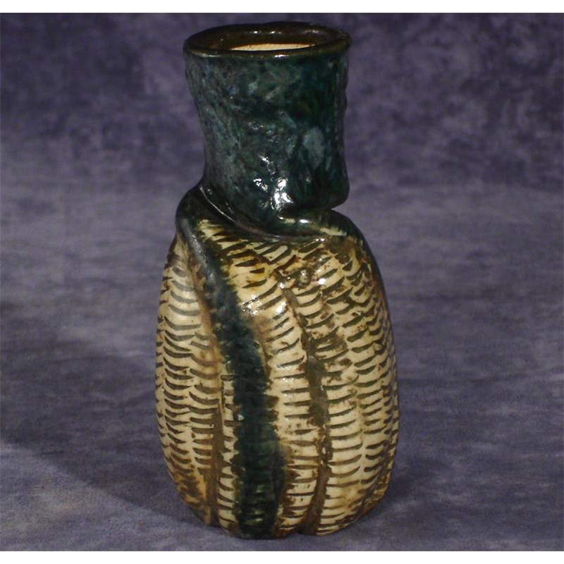 A Martin Brothers stoneware miniature gourd vase with twisted neck, incised and glazed in shades of green incised Martin London 9.5cm. high Charlotte & Peter Fiell 1900s & 1910s Decorative Art Taschen page 387 The Studio 1908 a comparable twisted gourd illustrated.