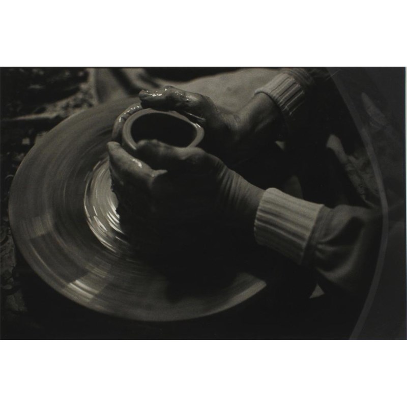 A black and white photograph of Lucie Rie potting a bowl by Terry Day