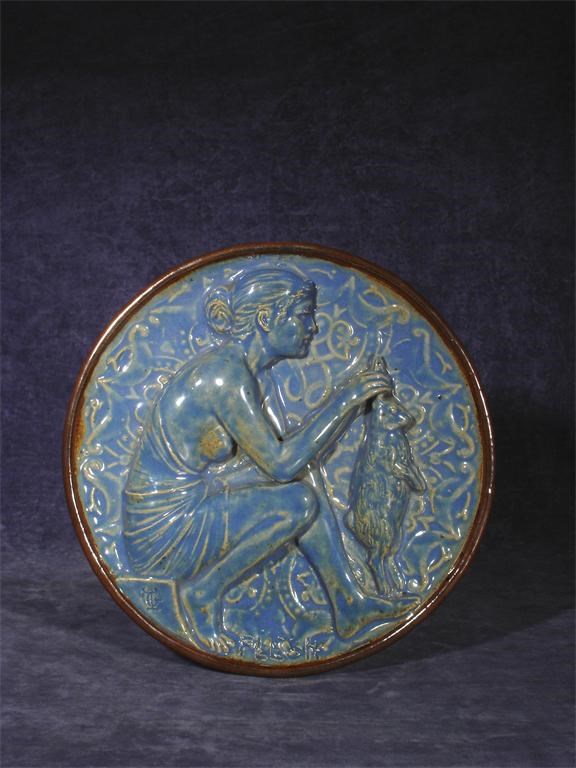 'Flesh' a Doulton stoneware plaque by George Tinworth, incised with an allegorical maiden holding a hare by its ears, glazed blue incised GT 24cm. diam. Provenance Millennium Collection, Sylvia Powell Decorative Arts