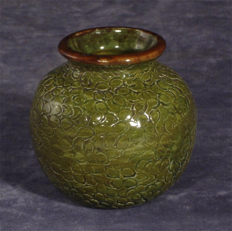 A Martin Brothers stoneware miniature gourd vase incised with decoration covered in an olive green glaze incised 2-98 Martin Bros London & Southall, Richard Dennis paper label 6.5cm. high Provenance Martin Brothers Pottery Exhibition, Richard Dennis 1978 catalogue number 592