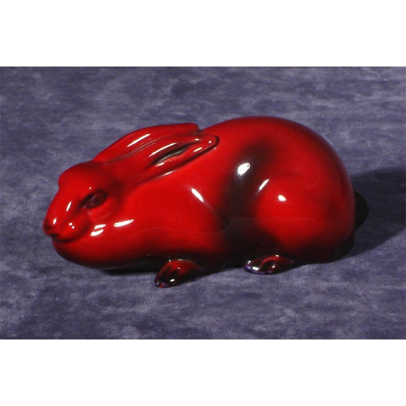 A Royal Doulton porcelain figure of an alert rabbit model no.119, designed by Charles Noke, covered in a flambe glaze printed factory mark, facsimile Noke signature, impressed 119 11cm. wide