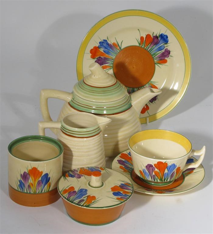 'Crocus' a Clarice Clif Bizarre part tea service painted in colours, comprising; pot and cover, preserve pot, four various cups and saucers, three side plates and a small cake plate various printed marks, minor damages