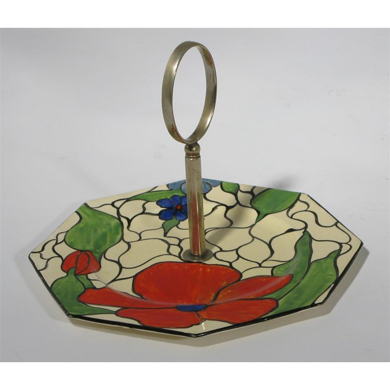 'Scarlet Flower' a Clarice Cliff Bizarre cake plate octagonal with electroplated stem, painted in colours printed mark, minor nicks to rim 19cm. diam.