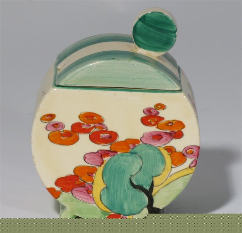 'Green Erin' a Clarice Cliff Bizarre Bon Jour preserve pot and cover painted in colours printed factory mark 11cm. high