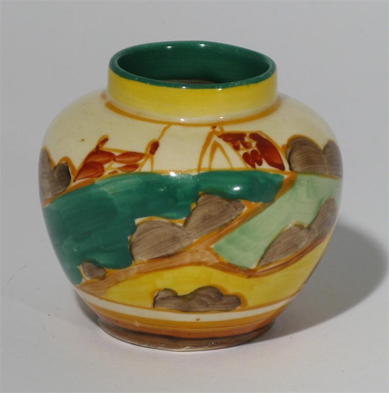 'Secrets' a Clarice Cliff Fantasque Bizarre miniature vase probably a salesman's sample painted in colours printed factory mark 6cm. high