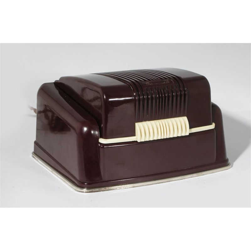 A Marquett bakelite type 63 radio receiver brown and cream bakelite applied factory label to base 21cm. wide
