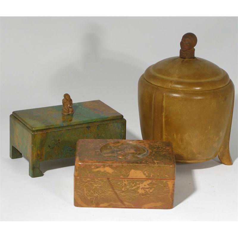 An Ebena mottled red and gold cigarette box and cover the cover cast in low relief with a female portrait roundel, a Tobacco jar and cover with Galalith pierrot finial, and another rectangular box and cover cast marks 13cm. wide Literature Ebena 1921-1931 Kunstmuseum Dusseldorf, page 66 catalogue number 20 for cigarette box