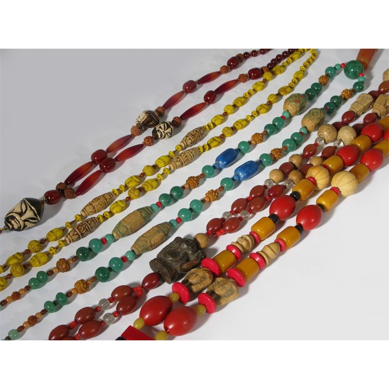 Five long Ebena plastic necklaces each with Oriental Galalith beads unsigned
