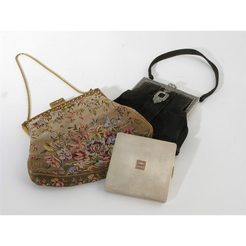 A silver compact square section with engine turned decoration, and two Art Deco clutch evening bags stamped marks WHM Birmingham 1948 8.5cm. square