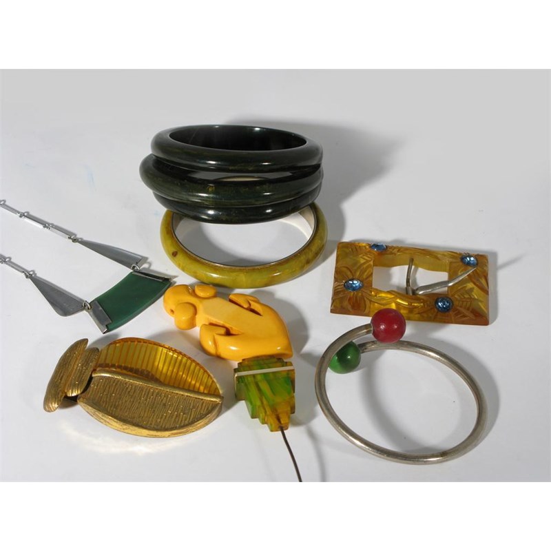 A selection of Bakelite jewellery including; three bangles, a belt buckle, a necklace and five various other items