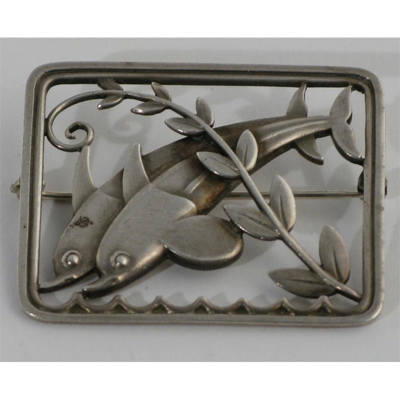 A Georg Jensen silver brooch model no.251, designed by Arno Malinowski, cast with two leaping dolphin stamped marks 3.5cm. wide