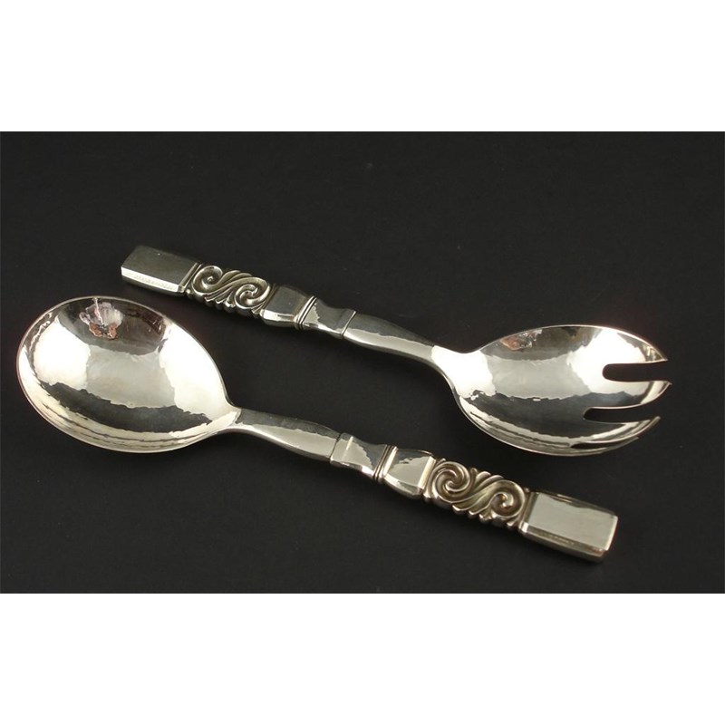 A pair of Georg Jensen silver Scroll servers stamped marks 21cm. long