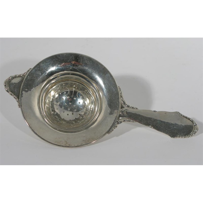 A Danish silver tea strainer in the style of Georg Jensen stamped marks 15cm. wide