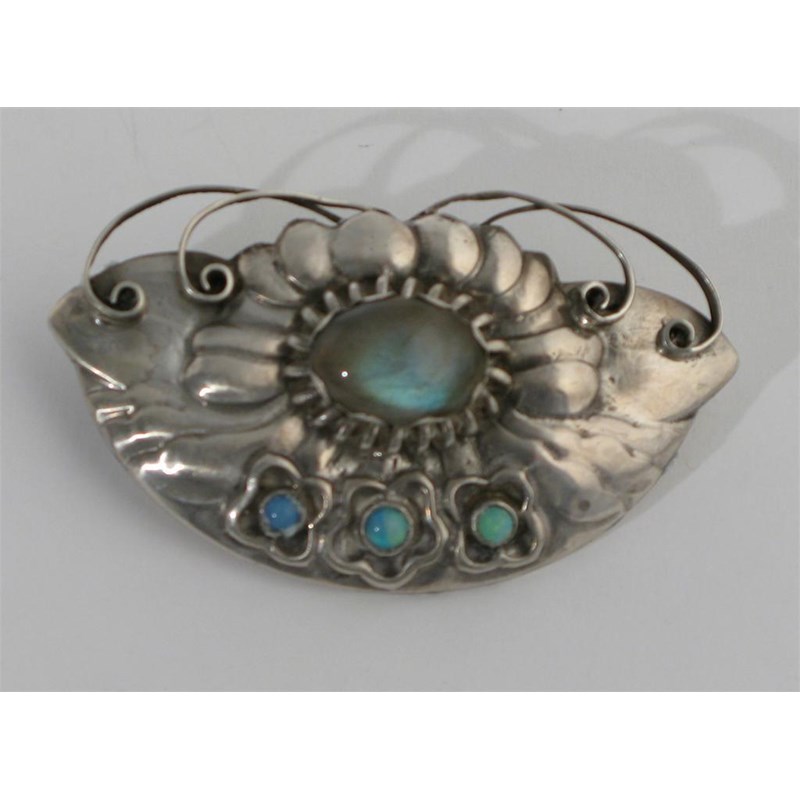 A Georg Jensen silver and moonstone brooch cast in low relief with flowers