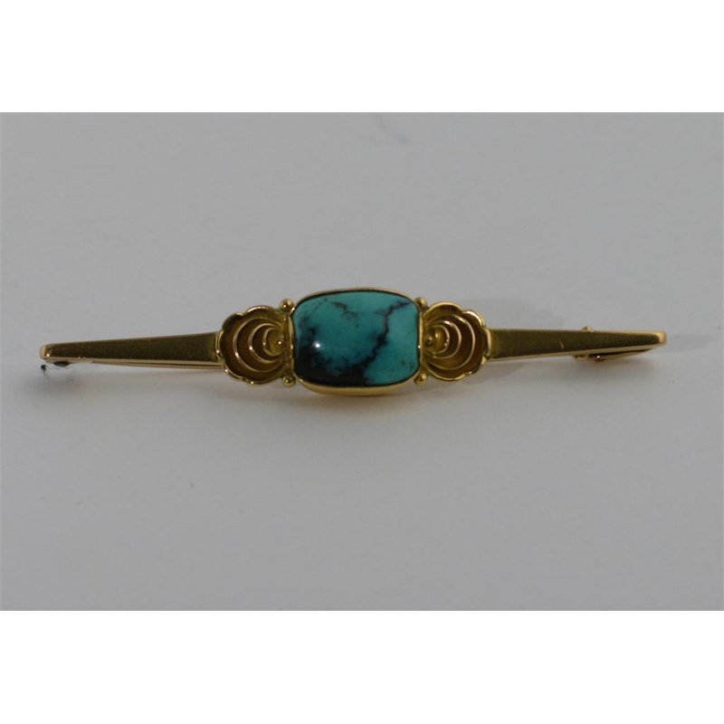 A Georg Jensen 18ct gold and turquoise bar brooch model no.24 stamped marks 6cm. wide