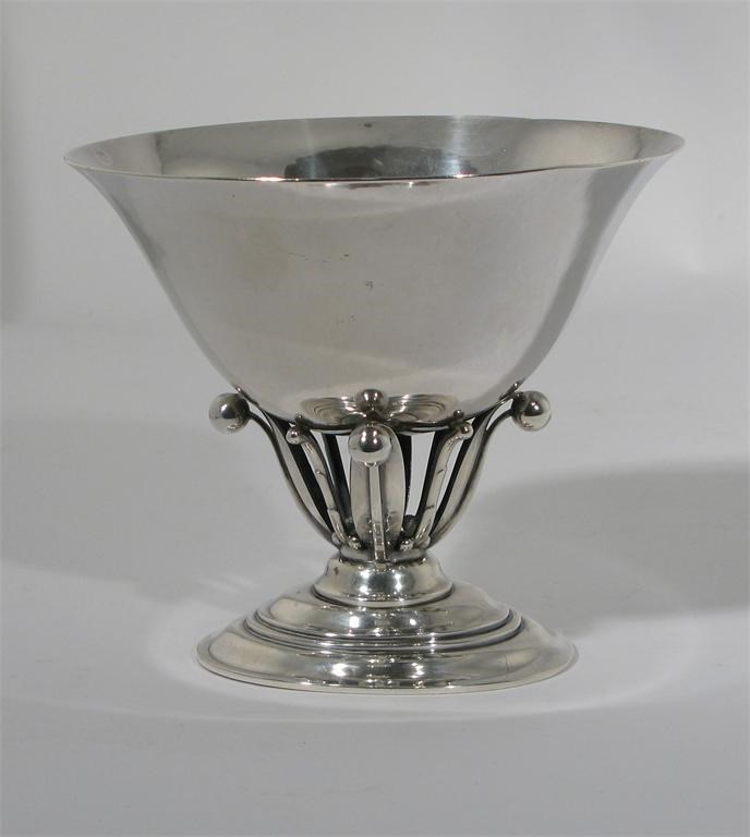 A large Georg Jensen silver bowl designed by Georg Jensen, model no.6, simple form on pierced foliate columns and domed foot stamped marks 14cm. high