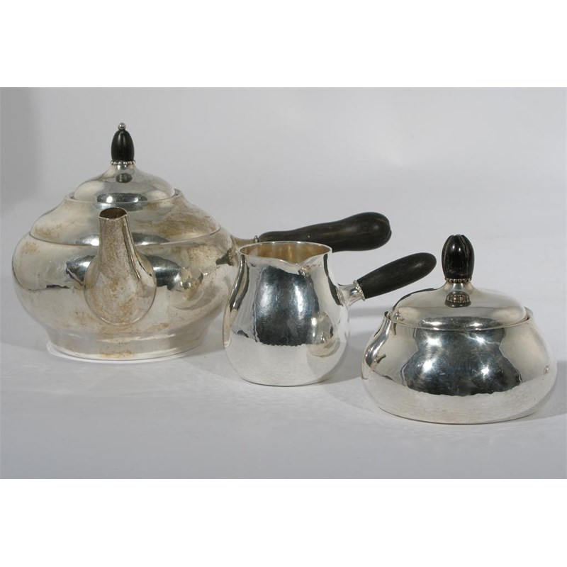 A Georg Jensen silver and ebonised wood three piece tea set comprising teapot and cover, and matched covered sugar and milk-jug, models 1B and 80A, various stamped marks teapot 13cm. high