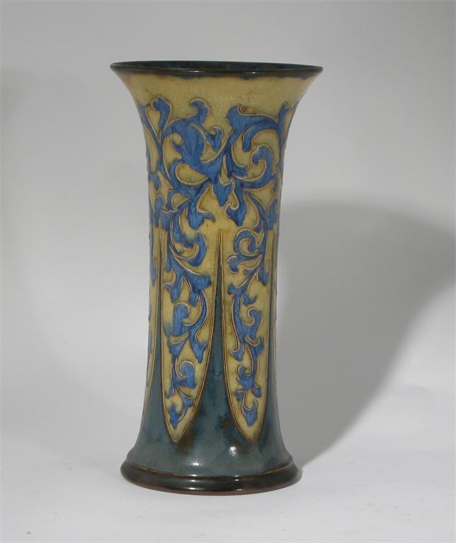 A Royal Doulton stoneware vase by Eliza Simmance, cylindrical form with everted rim, incised with scrolling foliage, in shades of blue and green impressed and incised marks, 30cm. high