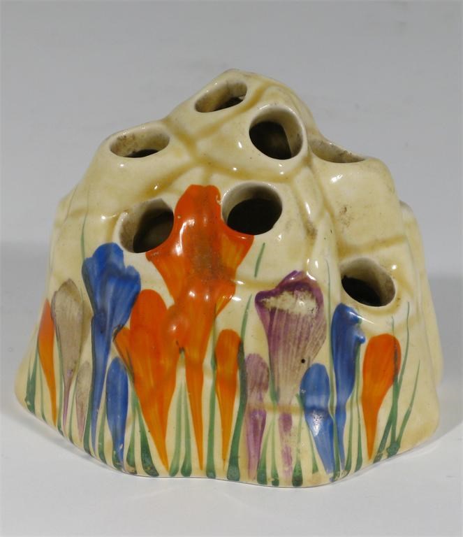 'Crocus' a Clarice Cliff flower brick painted in colours printed mark, wear 7.5cm. high
