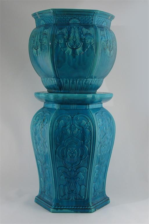 A Minton jardiniere and stand modelled in low relief with panels of foliage, glazed blue impressed marks, minor damages and loss 90cm. high