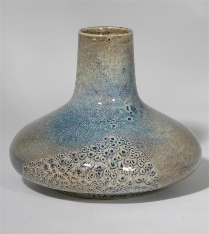 A Ruskin high-fired stoneware vase compressed form with silver/grey and purple snakeskin glaze impressed marks, dated 1923 20cm. high