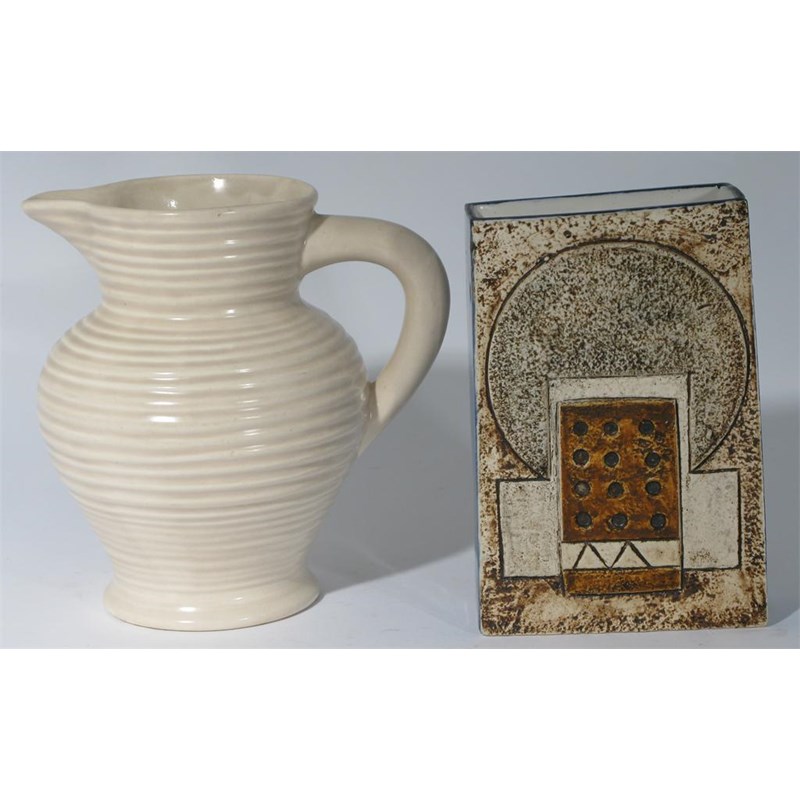 A Troika Pottery Slab vase by Penny Black, modelled in low relief a geometric design in shades of blue and ochre, and a Clarice Cliff George jug painted marks, minor chips 17.5cm. high