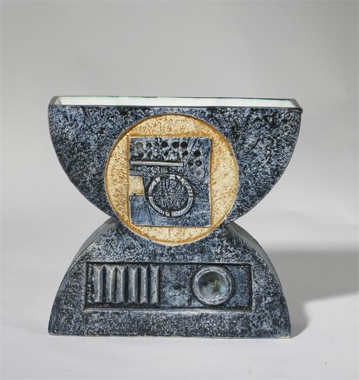 A Troika Pottery Anvil vase modelled in low relief with geometric panels, painted in shades of blue and ochre painted marks, 21.5cm. high