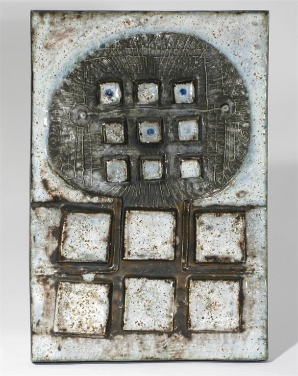A Troika Pottery wall plaque rectangular modelled in low relief with a key pad design, in shades of white, blue and bronze painted Troika St Ives, two small chips to back rim 26.5cm. high