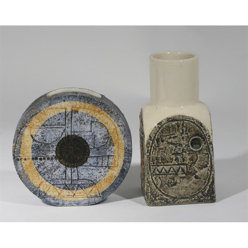 A Troika Pottery Spice Jar modelled in low relief with geometric panels, in shades of green and brown on a white ground, and a small Troika Wheel vase painted marks 15.5cm. high