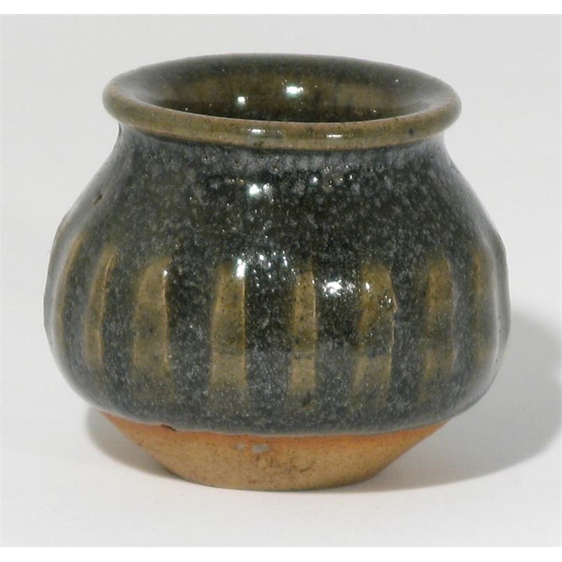 A Katharine Pleydell-Bouverie stoneware cut-sided vase covered in a green glaze impressed seal mark, painted BX 5.5cm. high