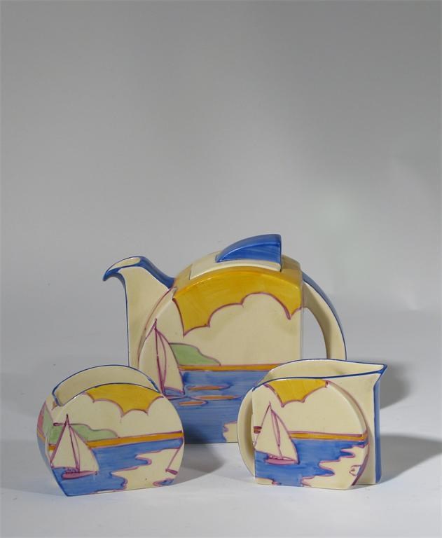 'Gibraltar' a Clarice Cliff Bizarre Stamford Tea trio comprising; teapot and cover, milk-jug and sugar basin, painted in colours printed factory mark, Lawleys Retailers mark, small chip to inside of teapot cover teapot 12.5cm. high