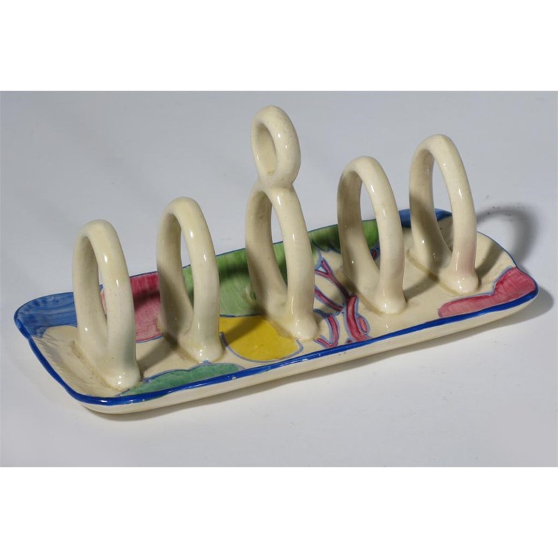 'Pastel Autumn' a Clarice Cliff Bizarre toast rack painted in colours printed marks, small chip to rim 16.5cm. wide