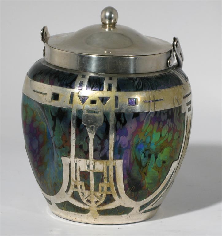 A Loetz metal mounted glass biscuit barrel and cover dimpled ovoid form, splashed iridescent, with Secessionist geometric overlay unmarked 17.5cm. high