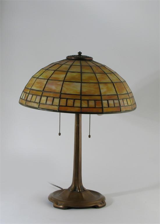 A Tiffany studios bronze table lamp with matched Geometric glass shade model no.533 stamped...
