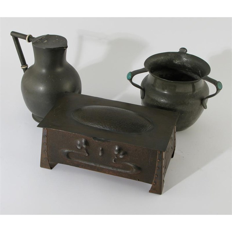 A patinated copper, cedar lined cigarette box stamped in low relief with stylised foliate design, and two other pewter items stamped marks 21.5cm. wide