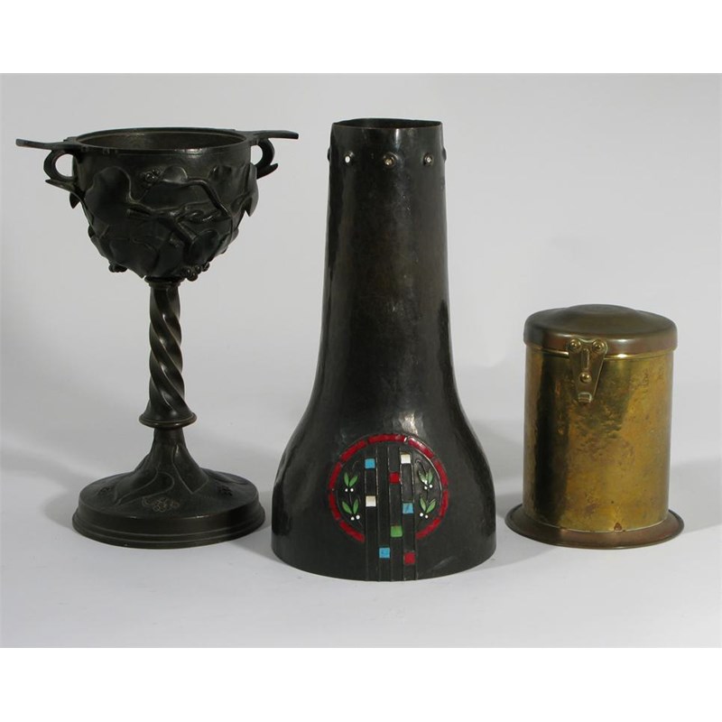 A Continental patinated copper vase decorated with a secessionist floral panel, enamelled in colours, a patinated metal twin-handled coupe and a brass jar and cover main impressed mark 26cm. high