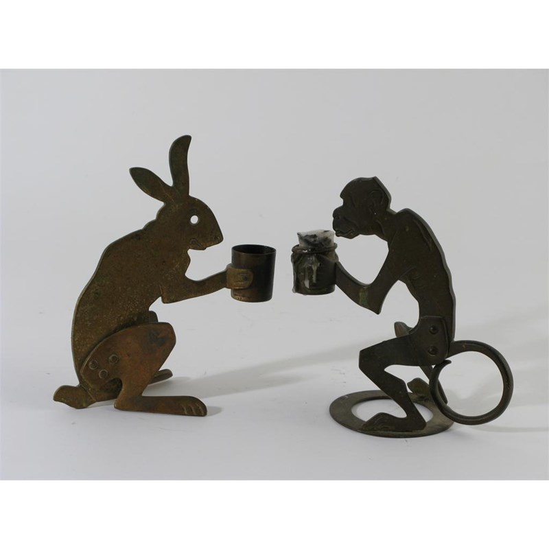 A pair of brass novelty candlesticks modelled as a rabbit and a monkey